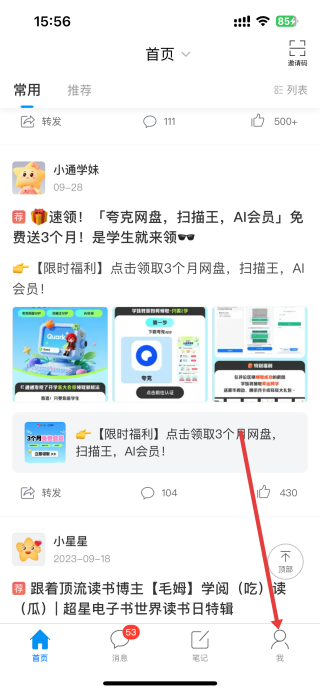 1、打開學習類應用,進入首頁,能看到各類推薦內容、互動數據等,點擊我。