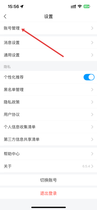 3、進入設置頁面,可看到賬號管理、消息設置等選項,點擊賬號管理。
