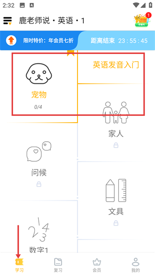 2、學習首頁以主題分類呈現內容,設限時會員折扣,底部含學習復習入口,適配入門級英語啟蒙場景。