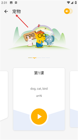 3、主題學習模塊拆分課程單元,以寵物主題為例,含詞匯及語法結構,搭配卡通場景輔助入門學習。