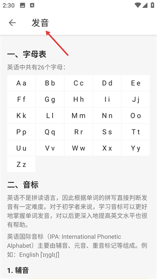 4、發音學習模塊涵蓋字母表和音標內容,解釋音標的學習價值,輔助用戶掌握英語基礎發音規則。