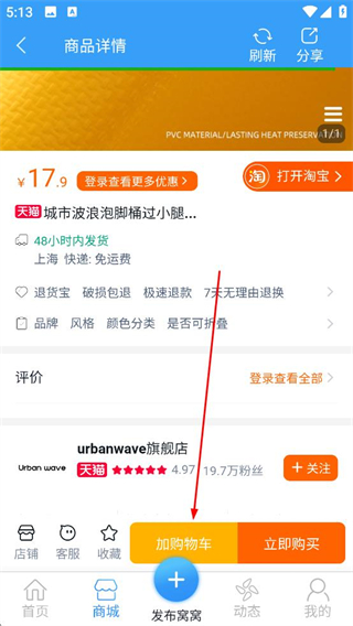 3、在商品詳情頁可查看價格、發貨地和退換貨政策等信息,點擊加購物車可將該商品加入購物車,以便后續結算購買。