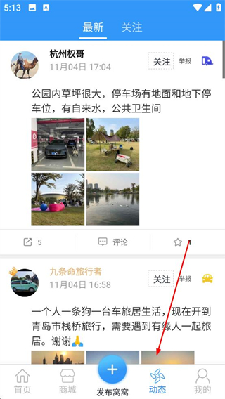 4、進入動態頁面可查看杭州牧哥、九條命旅行者等用戶發布的房車旅居動態,了解他們的旅居地點和生活情況,還可參與評論互動。