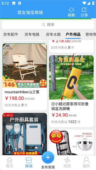 2、在窩友淘寶商城頁面可查看房車配件、戶外用品等分類商品,選擇戶外用品分類下的過小腿折疊泡腳桶點擊進入商品詳情頁。