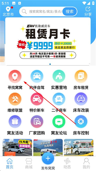 1、進入窩友自駕APP可查看尋找窩窩、約伴自駕等功能入口,點擊尋找窩窩可進入窩窩搜索頁面,查找合適的露營地點。