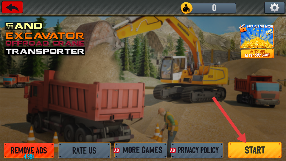 1、進入游戲初始界面,點擊START按鈕即可進入游戲,開啟泥沙挖掘機的操作體驗,準備進行后續的模式選擇和挖掘任務。