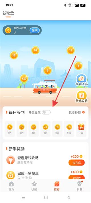 4、進入推薦板塊可參與每日簽到活動,領取谷粒金獎勵,也可查看賺錢攻略和新手獎勵,完成任務獲取更多谷粒金,提升使用軟件的體驗。