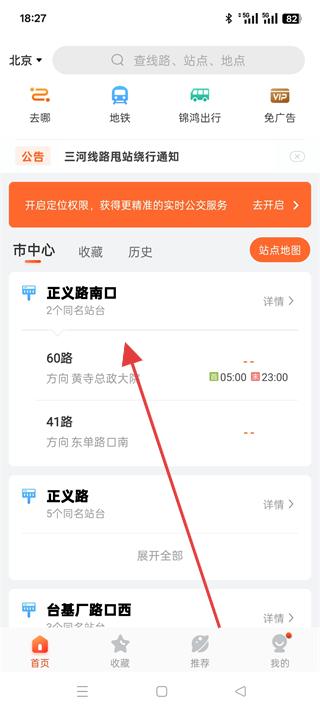 2、進入首頁可查看市中心的公交站點信息,如正義路南口的60路、41路等公交線路,了解運營時間和方向。