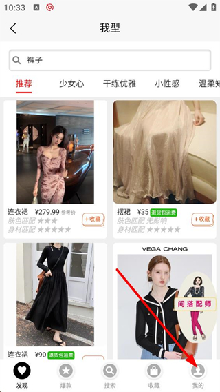 1、進入我型頁面,頂部設有搜索欄及推薦少女心等風格標簽,展示各類服裝及價格匹配度等信息,點擊底部我的按鈕,可進入對應頁面開展后續操作。