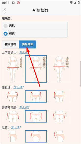 3、新建檔案中選擇簡易建檔模式,可對應自身情況選擇上下身比腰粗細等外形特征選項,完成穿搭檔案里的外形信息填寫環節。