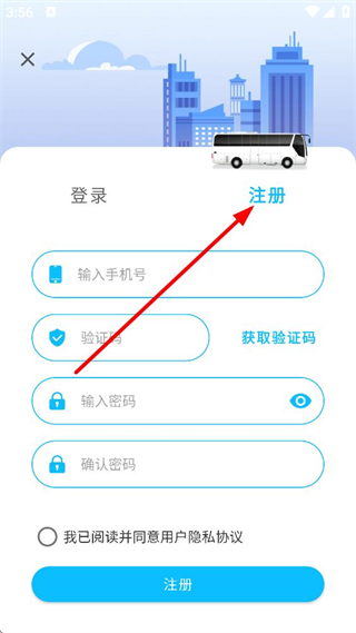 4、注冊界面可輸入手機號、驗證碼、密碼等信息進行注冊,注冊前需同意用戶隱私協議,方便新用戶注冊賬號使用APP功能。
