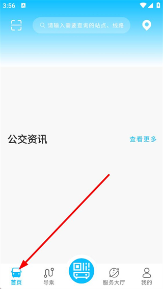 1、進入首頁,可搜索需要查詢的站點、線路,查看公交資訊,還有導乘、服務大廳等功能入口,方便用戶查詢公交信息和辦理相關業務。