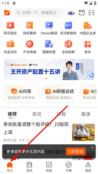1、打開東方財富Choice APP,進入首頁,可看到研究報告、財經要聞等功能入口,還有AI問答、研報總結等智能功能,能獲取各類財經資訊和數據。