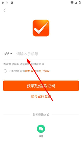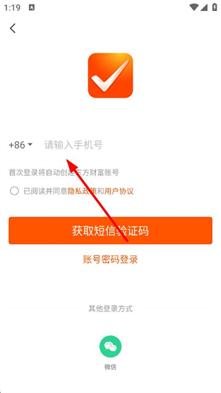 3、登錄界面,輸入手機號,勾選同意隱私政策和用戶協議后點擊獲取短信驗證碼,輸入后即可完成登錄,首次登錄將自動創建東方財富賬號。