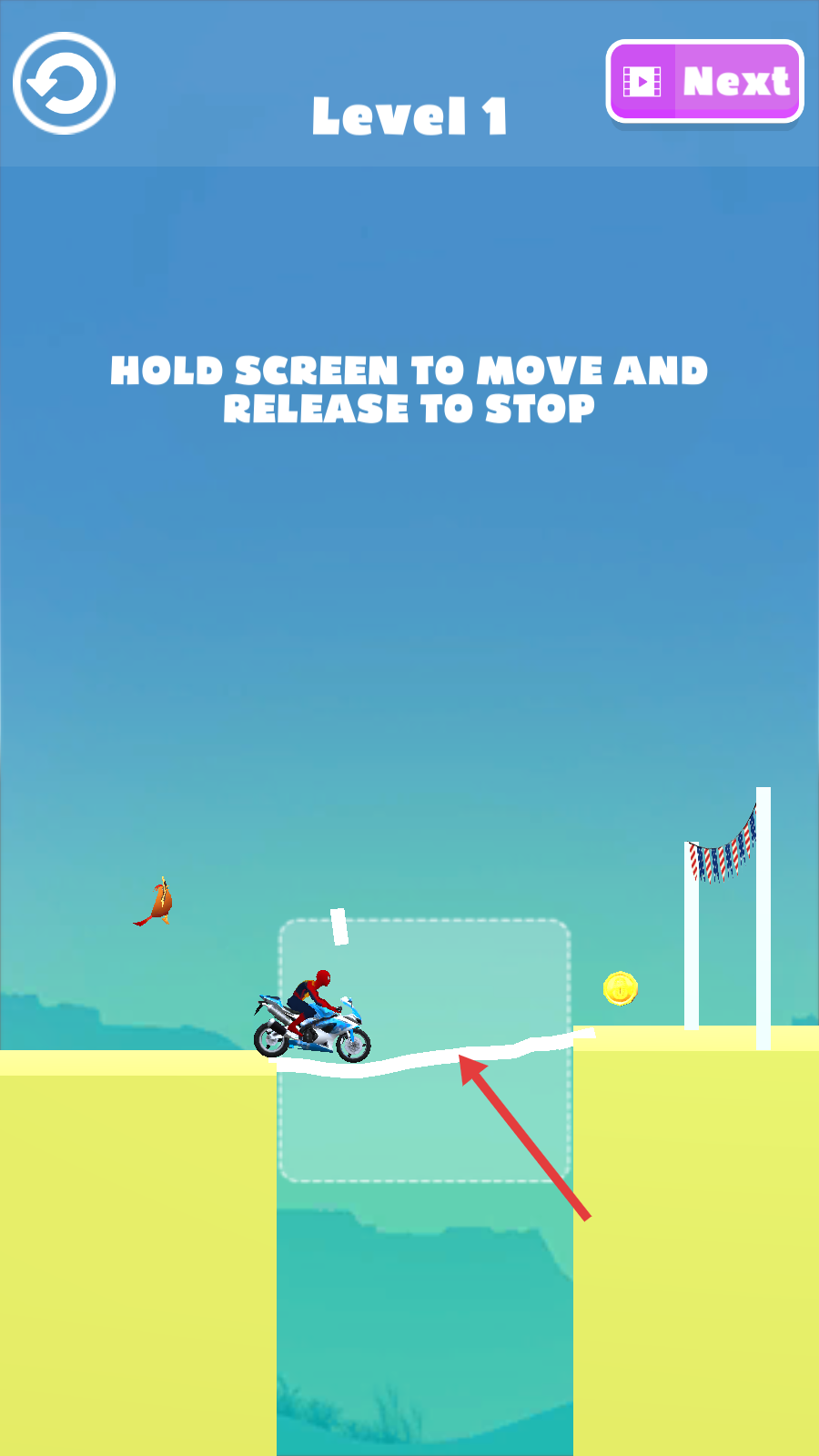 2、進入關卡后通過在虛線框區域內按住屏幕繪制線條,創建一條能讓摩托車順利通過障礙的道路,幫助摩托車前進。