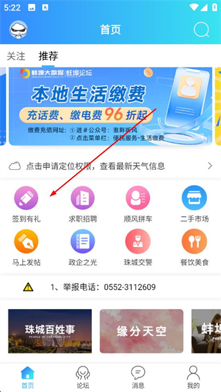 3、進入APP首頁可查看簽到有禮、求職招聘等功能入口,點擊簽到有禮可進入每日簽到頁面。