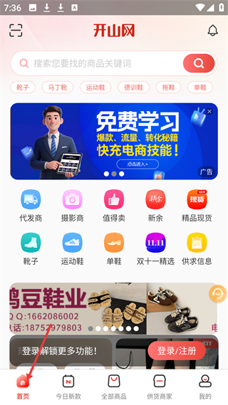 1、首頁有搜索欄,設代發商等功能入口,有靴子等鞋類分類,展示電商技能廣告及鞋類商家資訊。