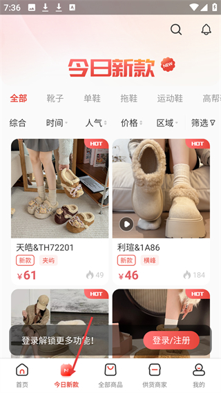 2、今日新款頁展示當日新款鞋,如天皓夾嶼款拖鞋、利瑄橫峰款棉鞋,按綜合等排序,標注價格和人氣值。