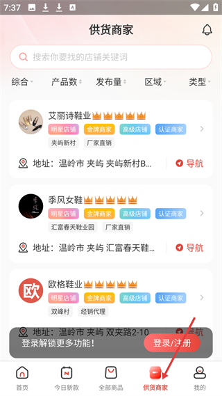 4、供貨商家頁展示艾麗詩、季風女鞋等商家,標注店鋪等級、地址,提供導航功能,方便尋找鞋類供應商。