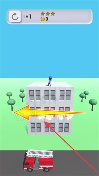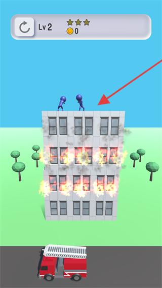 3、當進入Lv2關卡樓體火勢更大,且有更多人員在樓頂等待救援,要再次操控錘子,調整角度,瞄準起火樓層持續營救。