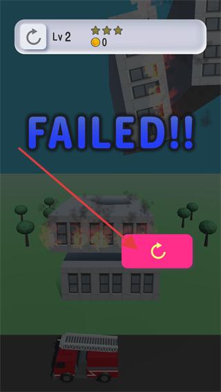 4、若滅火操作失敗屏幕會顯示FAILED,此時點擊重玩按鈕,重新開始當前關卡,救援樓頂人員。