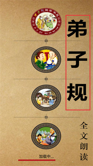1、啟動頁,以古樸風格展示主題,搭配傳統插畫與加載條,明確國學內容定位,引導進入全文朗讀模塊。