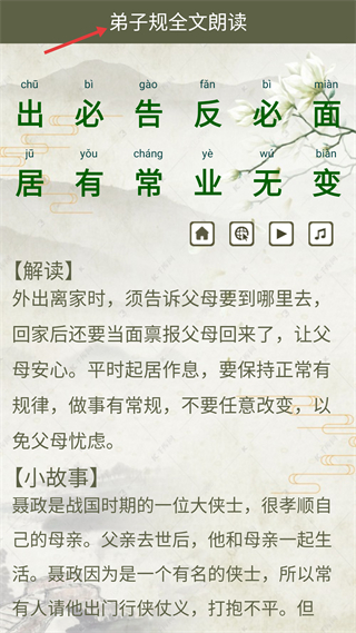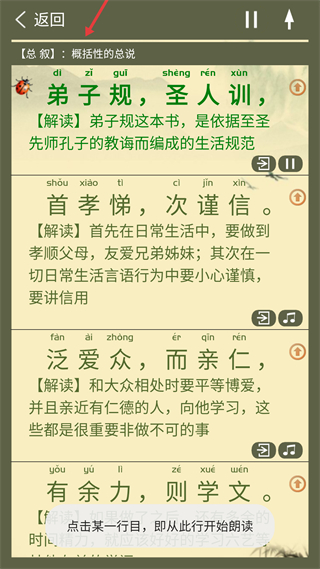 3、總敘模塊頁,呈現弟子規總敘內容,每句配拼音與解讀,支持點擊朗讀,幫助建立內容的整體框架認知。