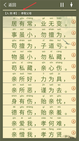 2.兩種學習模式:一種分段朗讀解釋便于孩子家長共同理解學習弟子規;一種全文順序循環朗讀,逐行跟蹤滾動顯示當前朗讀內容,便于孩子跟隨一起詠讀學習。