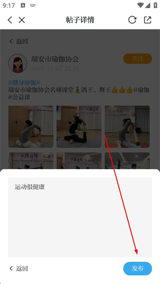 3、進入帖子詳情頁面查看發布者信息及帖子內容,可在評論區輸入內容,點擊發布按鈕參與互動。