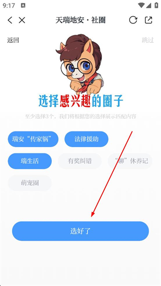 1、打開天瑞地安進入社群頁面,選擇感興趣的圈子,至少選擇3個后點擊選好了按鈕,完成圈子選擇進入社群主界面。