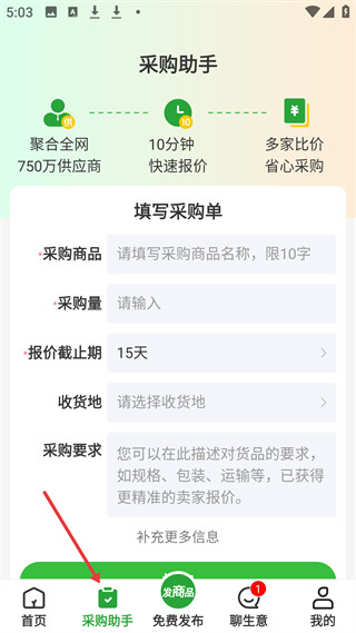 2、采購助手頁面能聚合全網供應商,實現快速報價與多家比價,可填寫采購單,包含商品采購量等信息。