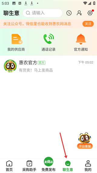 4、聊生意頁面可搜索聯系人,查看我的供應商、通話記錄等,還有惠農官方消息及平臺客服入口。