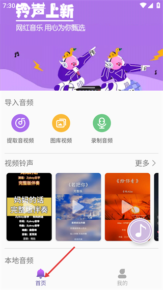 1、首頁有提取音視頻、圖庫視頻等導入方式,視頻鈴聲如媽媽的話、若把你可選,還有本地音頻管理,方便制作個性化鈴聲。