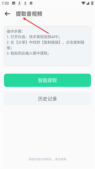 2、提取音視頻板塊可從抖音、快手等復制鏈接提取,操作步驟清晰,有智能提取和歷史記錄功能,助力獲取喜歡的音頻。