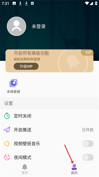 4、我的板塊可登錄,有本地音頻管理,升級VIP可開啟所有高級功能,還能設置定時關閉、推送等,滿足個性化使用需求。