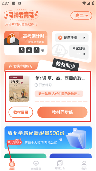 2、進入刷題首頁,可查看高考倒計時,使用刷題工具,通過教材同步練習功能關聯對應學科的內容。