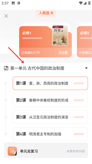 3、進入教材目錄頁,可查看教材的單元與課時結構,了解掌握進度,選擇具體課時開展同步練習。