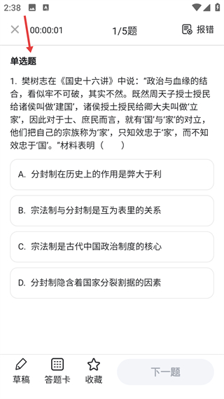 4、進入答題頁,可完成單選題型的備考題目,使用草稿答題卡等功能,按題序推進練習鞏固知識點。