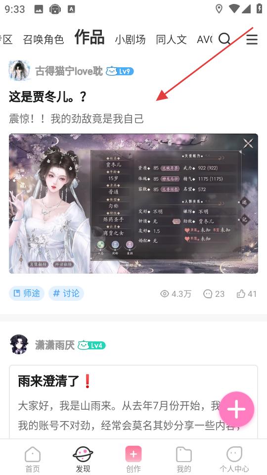 2、在為你推薦中若看到感興趣的作品討論帖,點擊進入作品詳情頁,查看玩家分享的劇情、角色信息,參與話題討論,了解作品玩法。