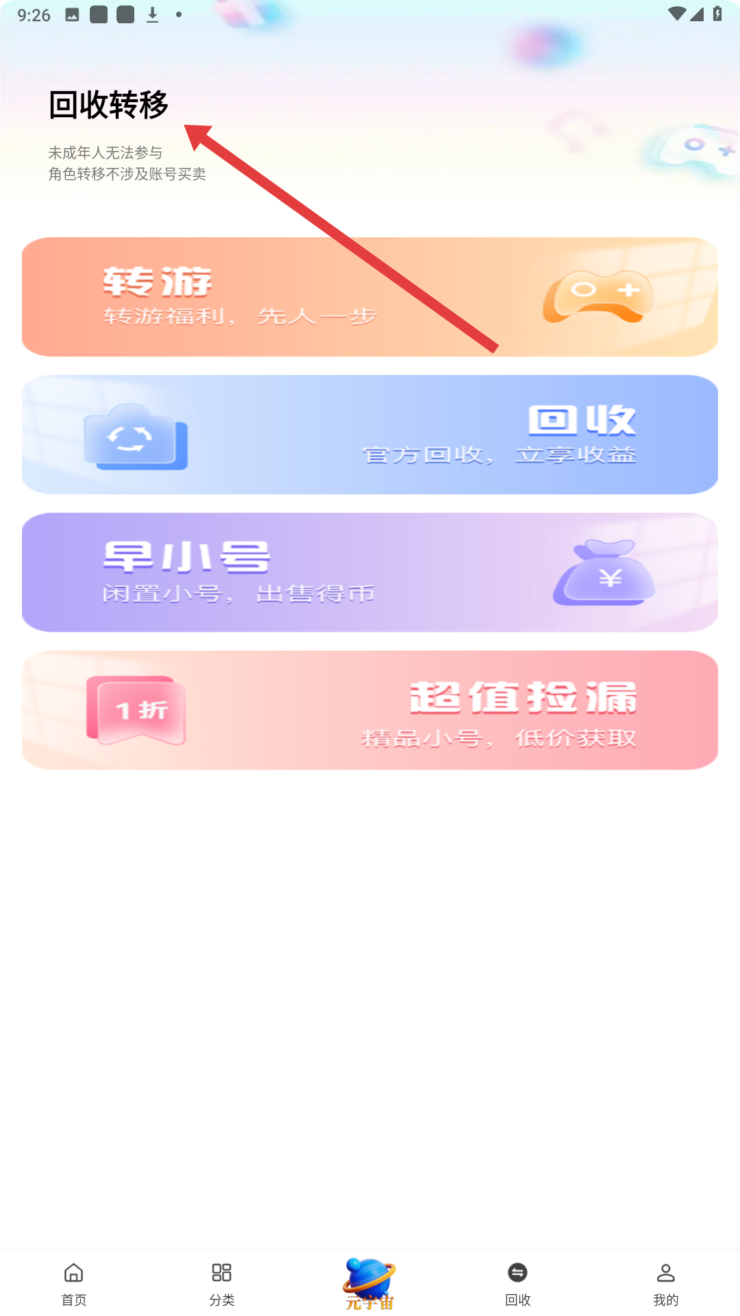 4、進入回收轉移頁面,可看到轉游、回收、早小號、超值撿漏等功能選項,能進行游戲角色轉移、賬號回收等操作,享受相關服務。