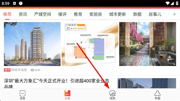 1、進入平臺首頁可查看房產資訊及各類房源展示,底部導航欄包含消息頭條找房咚圈等入口,點擊找房可進入房源查詢界面。