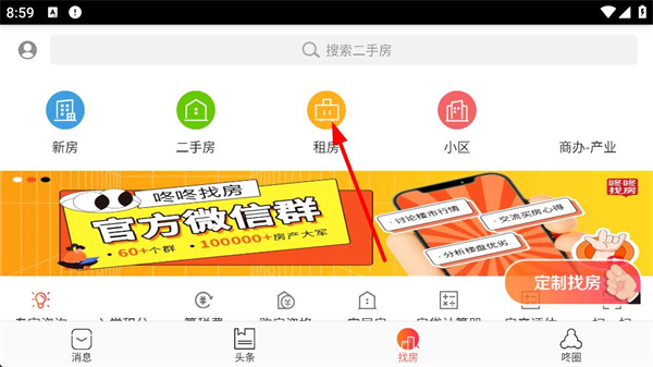 2、找房界面可選擇新房二手房租房等類別,同時能看到官方社群入口,可加入群聊交流購房租房相關信息。