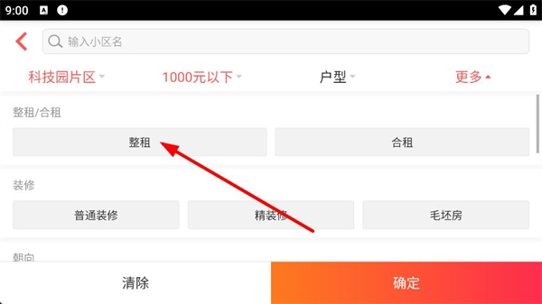 4、篩選界面還能選擇整租或合租,以及裝修類型朝向等細節條件,確認后點擊確定即可查看符合要求的租房信息。