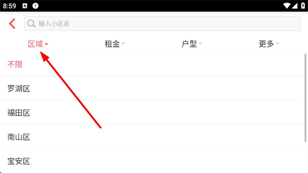 3、進入租房篩選頁可通過區域租金戶型等條件縮小范圍,區域選項包含多個行政區,按需選擇即可精準定位房源。