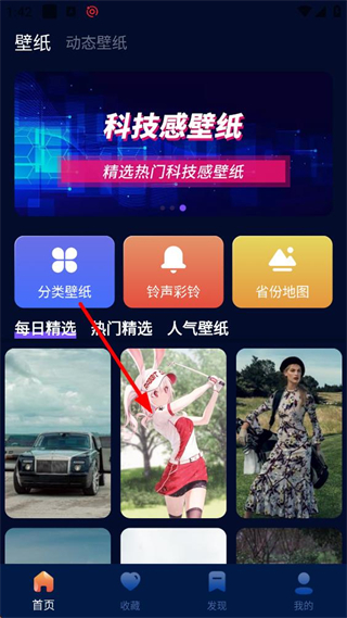 1、進入壁紙界面,可見科技感壁紙板塊及分類壁紙等功能按鈕,每日精選區域選中心儀的壁紙,即可進入該壁紙的詳情展示頁面。