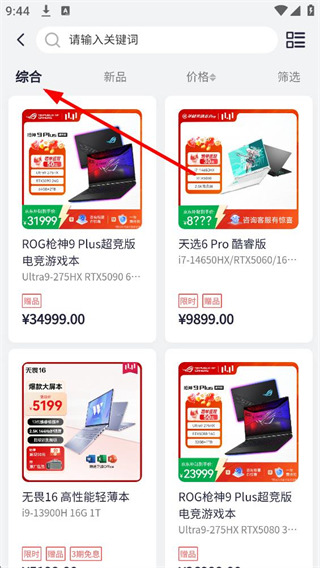2、商品列表頁,可看到綜合、新品、價格、篩選等分類標簽,展示有ROG槍神9Plus超競版、天選6Pro酷睿版等多款筆記本電腦,標注了價格和贈品信息。
