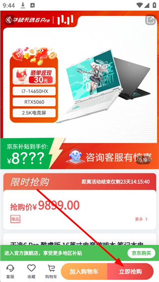 3、進入天選6Pro酷睿版商品詳情頁,能看到曬單返現30元、京東補貼到手價等信息,還有限時搶購倒計時,可選擇加入購物車或立即搶購。