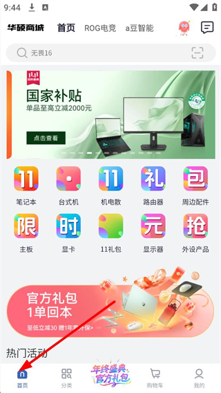 1、進入華碩商城首頁,可見國家補貼單品至高立減2000元的活動,還有筆記本、臺式機、機電散等分類入口,以及官方禮包活動展示。