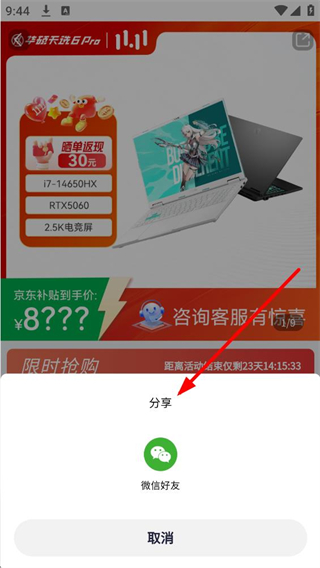 4、點擊分享后,可選擇分享至微信好友,方便將該款筆記本電腦的優惠信息分享給他人,也可選擇取消分享操作。