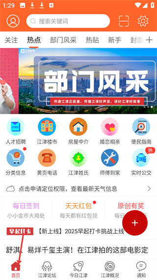 1、首頁有搜索功能,展示熱點等板塊,有人才招聘等服務入口,還有每日簽到等互動板塊,可獲取本地各類信息及服務。